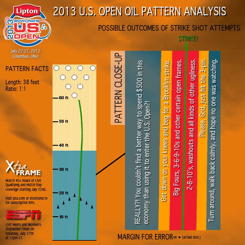 Well the 2013 US Open starts. I have bowled a couple of US Opens in the past and if you scroll down this page you will see one of my comments about what it's like bowling on that pattern. Now this year they shortened the pattern by a couple of feet back to 38 feet in length. But don't think that will make it any easier, cause it won't. The problems that are created by missing on the 42 foot will still exist on this years 38 foot pattern. The only real difference will be that the gutter will be at about the 9 board instead of the 12 board like it was a couple of years ago. Also you will be using slightly less aggressive bowling balls. I say slightly less because the best way to play this condition is to stay with a little more aggressive ball than you would think and use a weaker or less aggressive hand release.